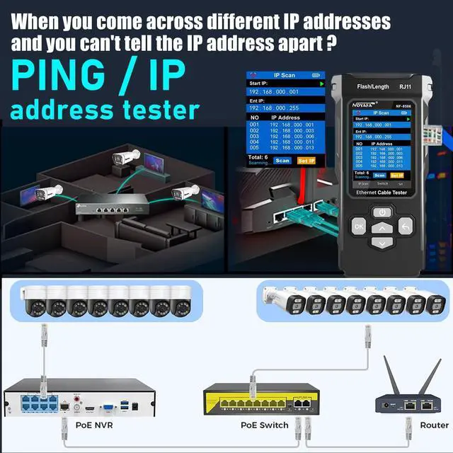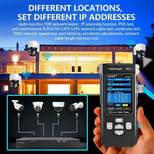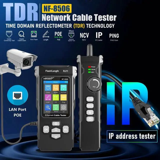 Network Cable TesterNewly upgraded multifunctional NF-8506 TDR network tester, an IP test tool with IP scanning function, POE test, anti-interference RJ11 RJ45 CAT5 CAT6 network cable ,test,connectivity test, Ping network speed test, port flashing, Sensitivity adjustment, network cable length function test