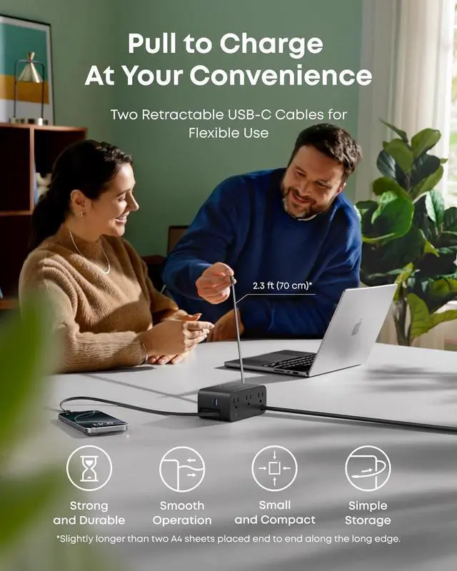A: The built-in cable is designed for compact desktop use. For longer reach, we recommend using a 3 ft (1 m), 5 ft ( 1.5 m), or 6.6 ft (2 m) charging cable with the USB-C2 or USB-A ports.