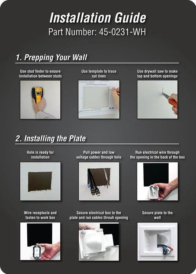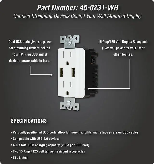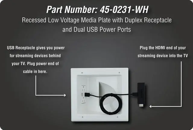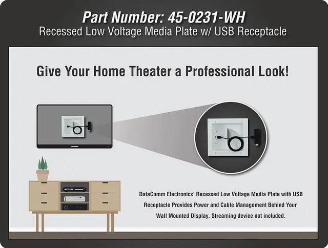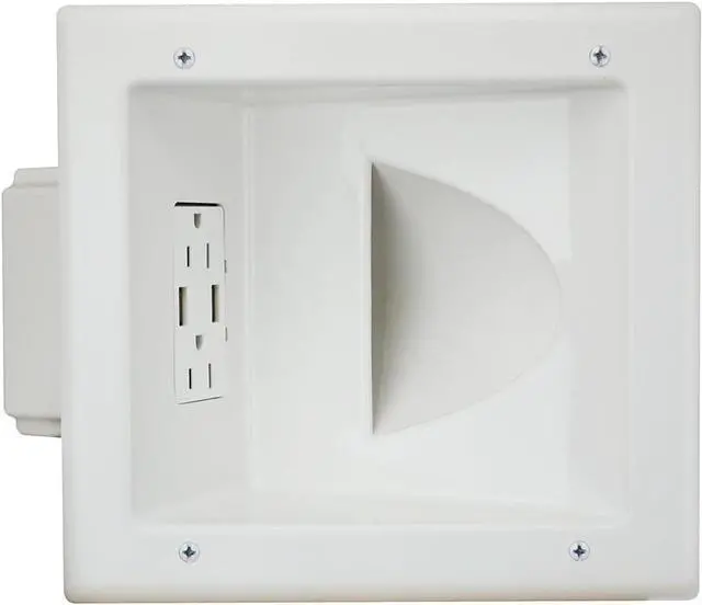 The DATA COMM Electronics 45-0231-WH USB Recessed Media Box with Duplex Receptacle and Dual 4.0 Amp USB Ports offers a comprehensive solution for managing power and cable connections behind your wall-mounted TV. Its low-profile design ensures a sleek, flush installation that fits seamlessly behind even the industrys thinnest mounts and TVs, maintaining a clean and modern look. Designed for optimal cable management, this media box features a large pass-through opening capable of accommodating up to 15 low-voltage cables, including AV and HDMI connections. This spacious opening simplifies cable organization, keeping your entertainment area free from clutter. The built-in 15 amp/125-volt duplex receptacle provides reliable power for your devices, while the dual USB ports, with a combined 4.0 amp charging capacity, are ideal for powering tablets, smartphones, gaming accessories, and other mobile devices. These features offer convenient and efficient charging options directly at the installation site. Installation is quick and hassle-free, thanks to innovative mounting wings that securely fasten to the drywall as you tighten, eliminating the need for additional low-voltage mounting brackets. This design ensures a sturdy and professional finish without the complexity of traditional installations. With its versatile features and modern design, the DataComm Electronics 45-0231-WH USB Recessed Media Box is the ideal choice for anyone looking to streamline their home entertainment setup with reliable power, efficient cable management, and convenient device charging capabilities.
