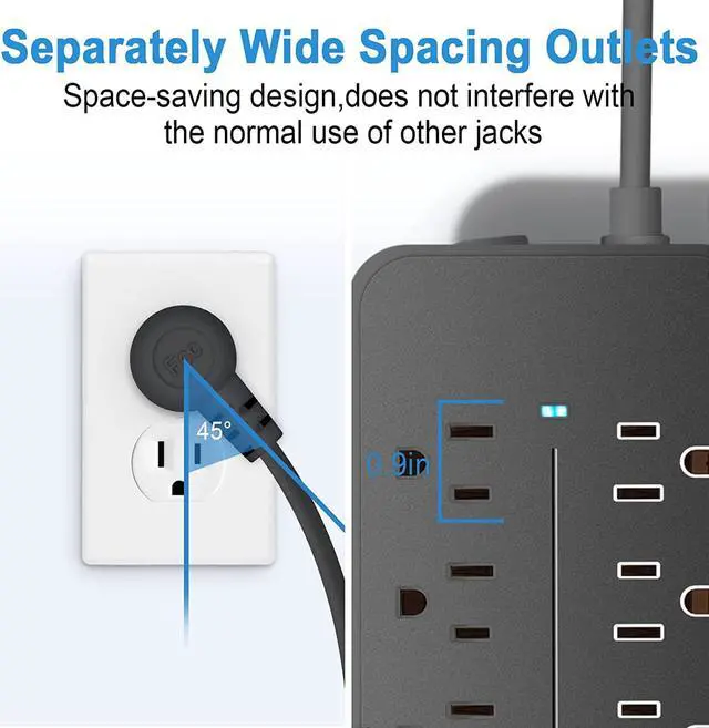 Flat Plug Extension CordFlat Wall Mounted Power Strip Surge Protector is designed with a 6ft extension cord, 45 degree low profile flat plug power strip that will not block the bottom receptacle of the duplex wall outlet. Sometimes you need to mount the power strip surge protector behind the TV or under the cabinet, we added 2 mounting holes on the back for easy hanging.