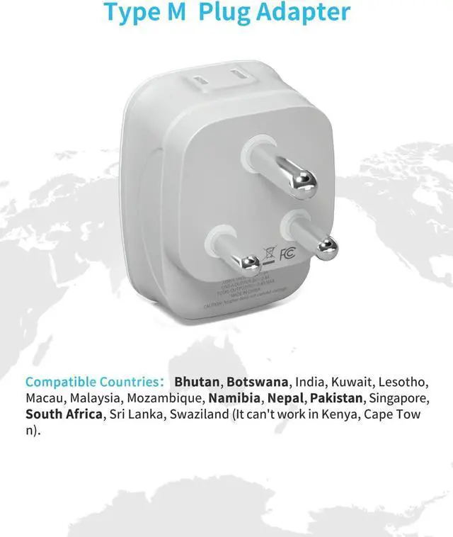 TYPE M TRAVEL PLUG ADAPTER--Compatible in overseas countries countries such as Bhutan, Botswana, Parts of India, Kuwait, Lesotho, Macau, Malaysia, Mozambique, Namibia, Nepal, Parts of Pakistan, Singapore, South Africa, Sri Lanka, Swaziland etc.