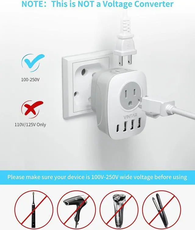 IMPORTANT NOTES-- This is NOT A CONVERTER. This plug adapter is only compatible for 110V-250V wide voltage device, If you want to use your hair dryer, straightener, electric toothbrush or razor, they MUST support 110V-250V Dual Voltage, otherwise you may need a power voltage converter.