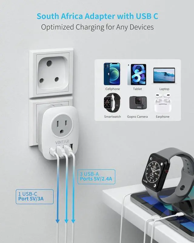 6-IN-1 SOUTH AFRICA POWER ADAPTER-- The South Africa travel plug adapter turns one Type M socket into 2 standard American outlets & 3 USB and 1 USB C charging ports, Max Capacity Up to 2500 Watt (max 250 Volt, 10 A); 3 USB Ports can charge up to 2.4A, USB C charge up to 3A, owing you charge 6 devices simultaneously. Ideal for Cell Phone, Laptops, GoPro, Camera, Power Bank etc.
