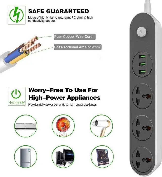 Good Quality Guarantee: Made by fireproof ABS plastic and PVC copper cable, guarantee charging security and overload protection.