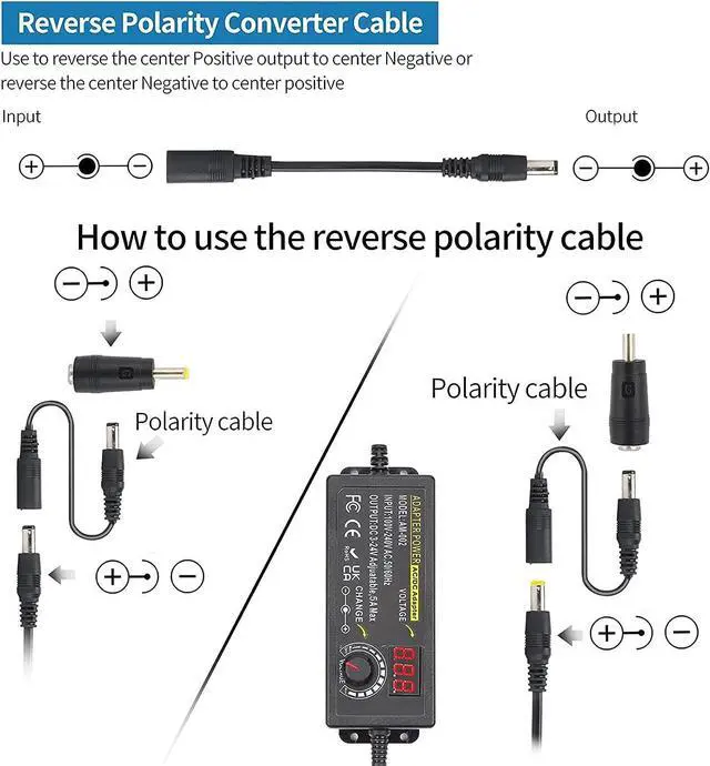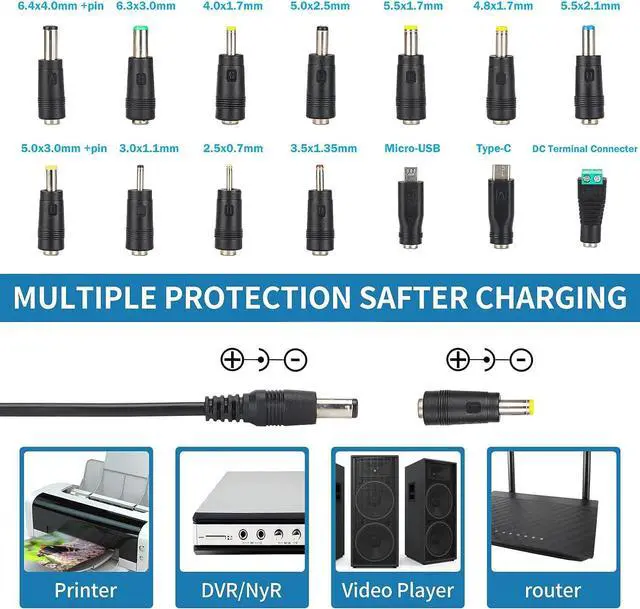 14 Plugs DC connectors & 1 Reversed Polarity CableIt comes with an original 5.5 x 2.1 mm tip and 14pcs frequently used tips: 6.4 x 4.0 mm+Pin, 5.5 x 2.1 mm, 5.0 x 3.0 mm+Pin, 5.0 x 2.5 mm, 6.3 x 3.0 mm, 5.5 x 1.7 mm, 4.8 x 1.7 mm, 4.0 x 1.7 mm, 3.5 x 1.35 mm, 3.0 x 1.1 mm, 2.5 x 0.7 mm, Micro-USB, Type-C and DC terminal connector. You can screw wires onto it easily, perfect for DIY projects. With these plugsreversed polarity cableand and different voltage output, you can save a lot of buying different voltage ac adapters.