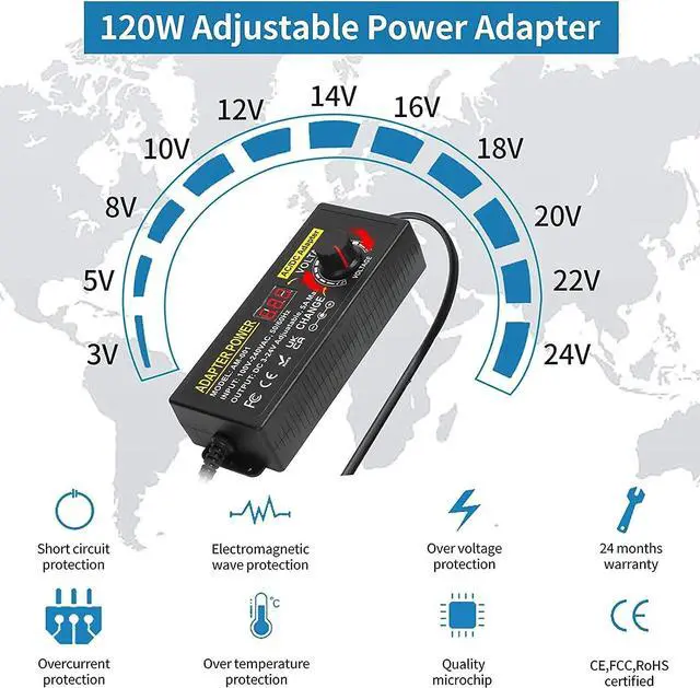 3V~24V 5A 120W Universal Power SupplyThe 120W all-in-one multipurpose AC/DC adapter fit for many 3~24V 5A electronics such as DC linear motor, DC pump, LED strips, under-cabinet light, TV Box, smart speaks, wireless routers, essential oil diffuser, humidifier, USB fan, Wifi camera, USB Hub, hard disk box, digital photo frame, DVR NVR surveillance system etc and other devices under 120W.