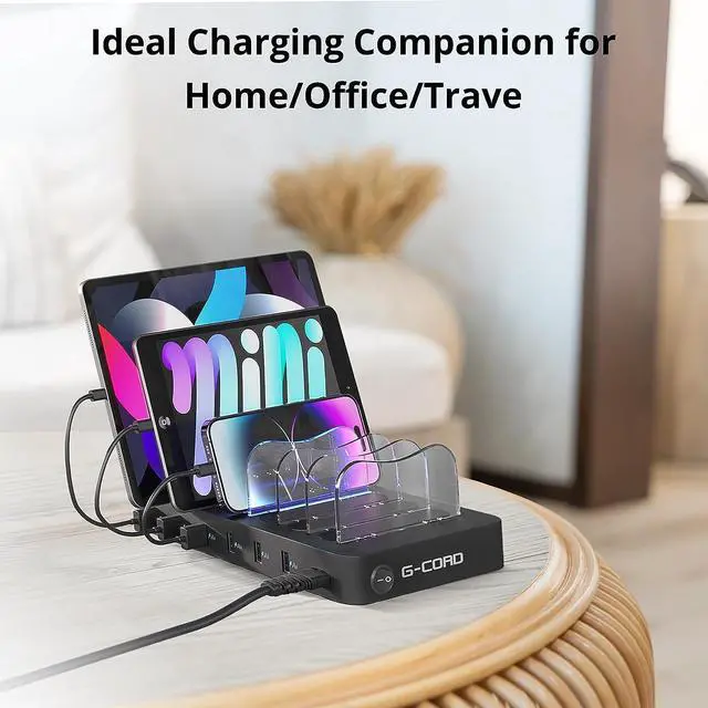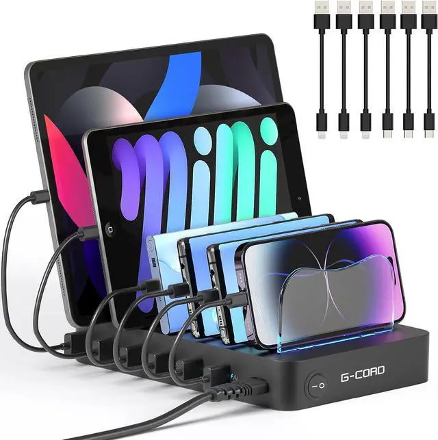 G-Cord 6 Port Multiport USB Charging Station, Detachable Desktop Docking Station for Smartphone & Tablet with 6 Pack Mixed Cables