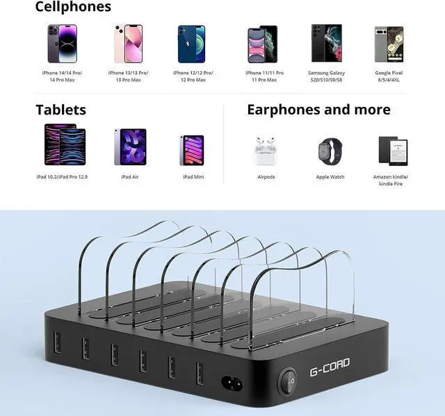• 6 slots, 6 USB ports and 6 cables. Hold and charge up to 6 devices. Our USB Charging Station works smoothly with devices such as Apple iPhone, iPad, Kindle and Android smartphones, tablets and more.