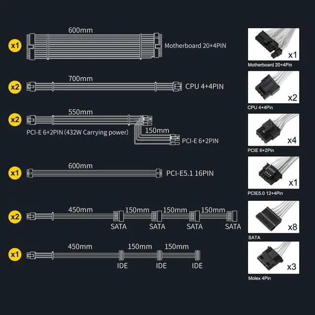Fully Modular: Full module with flat white cables, improve airflow & strengthen cable management
