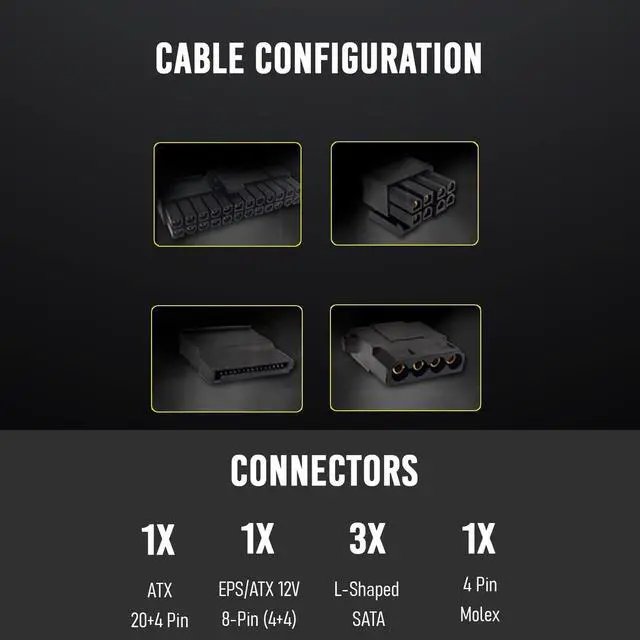 • Compatible with ATX 12V 2.3 with 3 x L-Shaped SATA Cables for easier installation in a compact desktop chassis