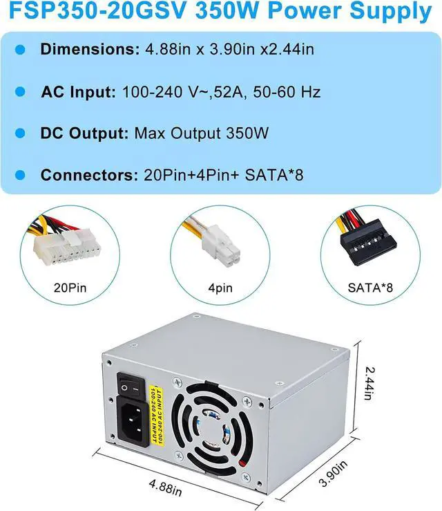 Input & Output100-240 V, 50-60 Hz, 52A. DC Output: Max Output 350W. The FSP350-20GSV 350W POE Power Supply is 100% Brand New, each item has been tested and in good condition before shipping.