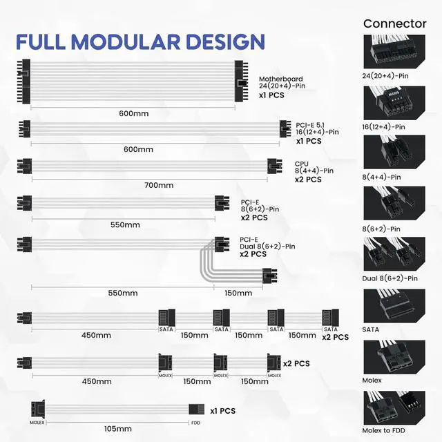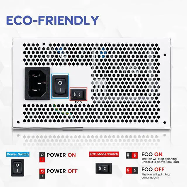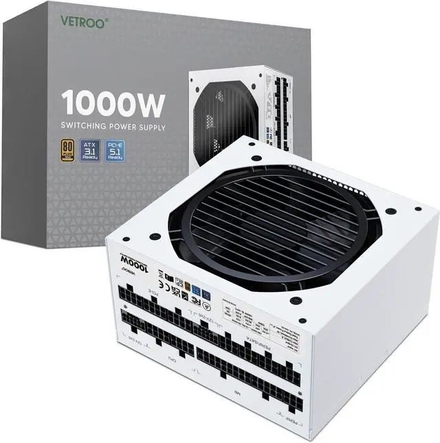Model No.1000G5ColorWhiteMaximum Power1000WDimensions5.5 " x 3.4" x 5.9"Main Connector24PinFans1 x 120 mm Fluid Dynamic Bearing FanEnergy-Efficient80 PLUS GOLD Certified @115VAC Input100-240V~12-6A,50-60HzOutput+5V@ 22A, +3.3V @22A, +12V @83.5A, -12V @0.3A, +5VSB @3AModularFull ModularTypeATX / ATX 3.0 (ATX 3.0 Compatible)Multiple ProtectionsOCP, OVP, UVP, OPP, SCP, and OTPCompatible (GPUs)Fits for NVIDIA 20 series, 30 series 40 series and AMD graphics cardTest NotePlease connect to the 24 Pin test starter, this will allow the PSU to be powered on without plugging into the motherboard.Energy-Efficient80 PLUS GOLD Certified & Cybenetics Platinum & Cybenetics LAMBDA Noise Level A Rating Ceritfied @115V 1000W Power Supply 100% Japanese Capacitors Quiet Operation Full Modular Design Certifications Wide Range Compatible Smaller in Size Fluid Dynamic Bearing Fan Specification