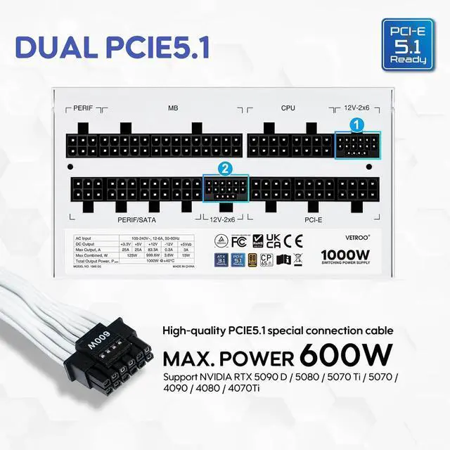 Dual PCIe Gen 5.0 ports ( Included 1PCS Native 12VHPWR Cable