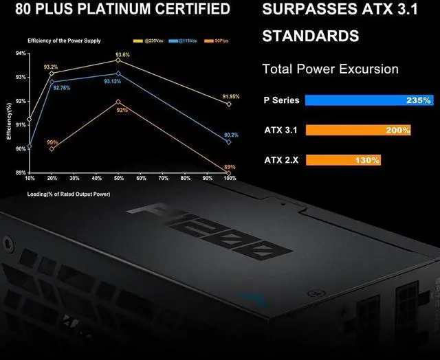 • Silent & Intelligent CoolingP1200 got LAMBDA A+ noise rating, equipped with a one hundred forty millimeter fluid dynamic bearing fan, the P1200 operates in near-silent fanless mode below sixty percent load or fifty-five degrees Celsius. The ECO fan curve adjusts speed dynamicall