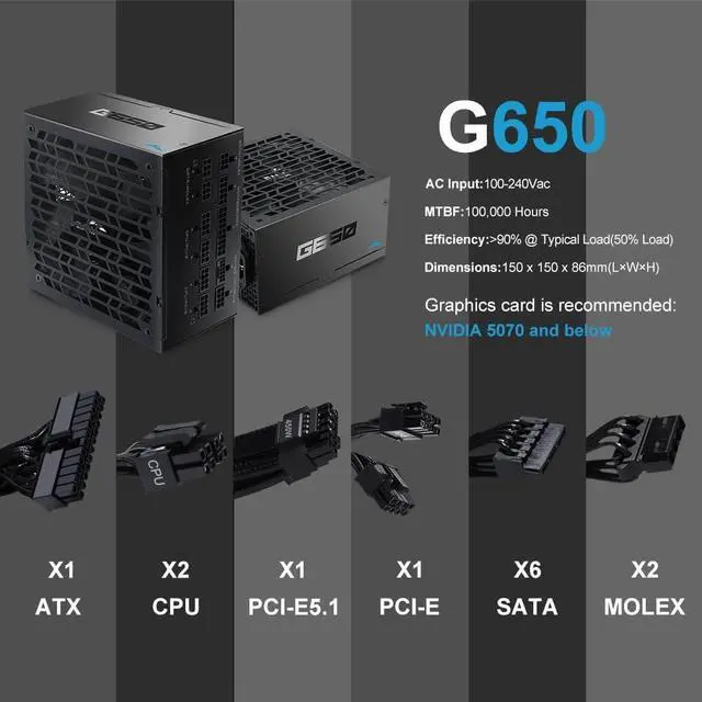 650W 80 PLUS Gold High Efficiency - Rated at 650W with 80 PLUS Gold certification, delivering over 90% efficiency at typical loads. Reduces energy loss and heat output while providing stable, reliable power for gaming PCs and high-performance desktop systems.