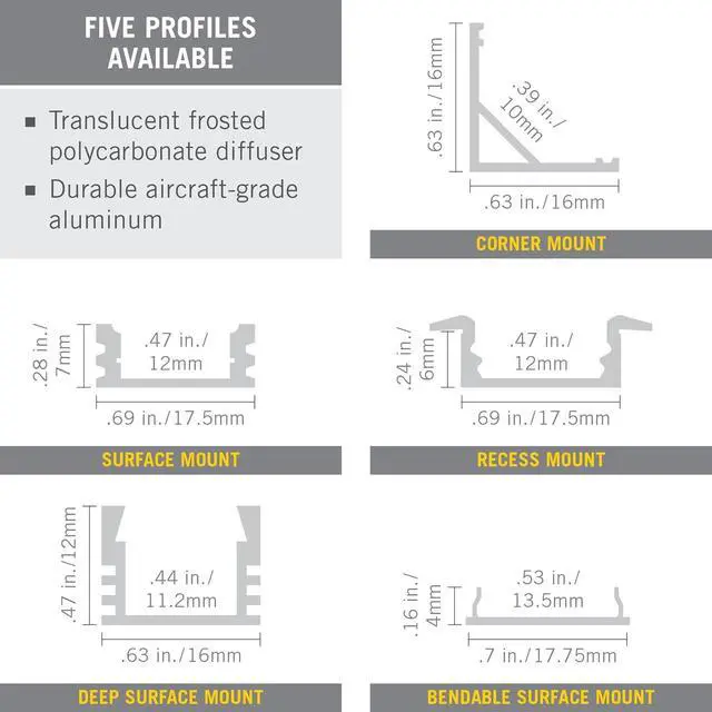 Flat profile for surface or recessed installations; corner profile for 45° directional lighting