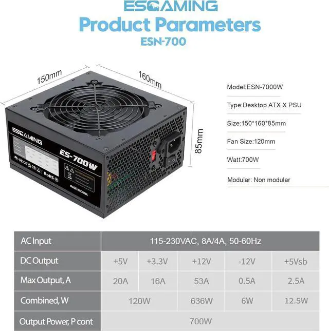 ESGAMING 700W Non Modular Power Supply with Low-Noise 120mm Fan ATX PSU, 115/230 Voltage Switch PFC Protection