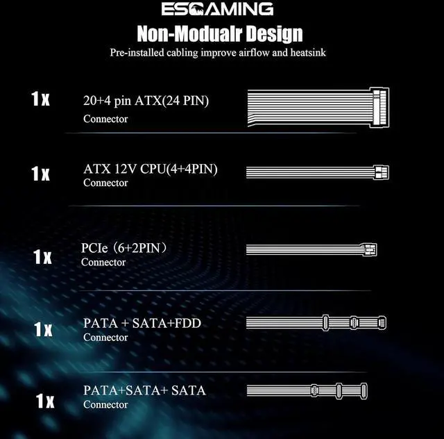 Connectors : 1 x 24pin Main Power, 1 x 4+4pin CPU 12V, 2 x PCI 6+2pin, 4 x SATA, 4 x PATA, 1 x FDD