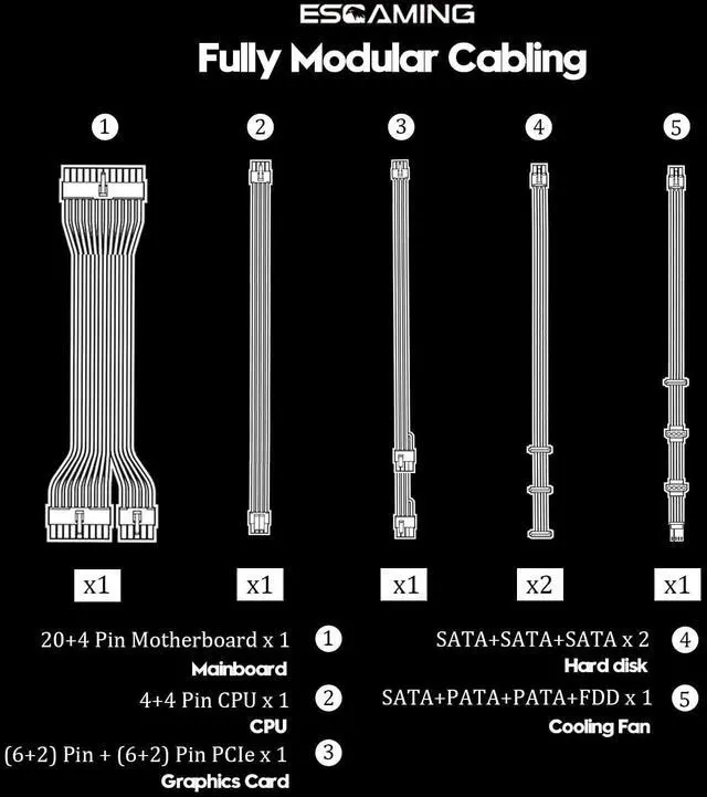 Cables1 X (20+4)Pin Motherboard Connector; 1 X 12V(4+4) Pin Connector; 4X PCI-E(6+2)/8Pin Connector; 6 X SATA HDD Connector; 3 X IDE/PATA Connector; 1 X FDD Connector.
