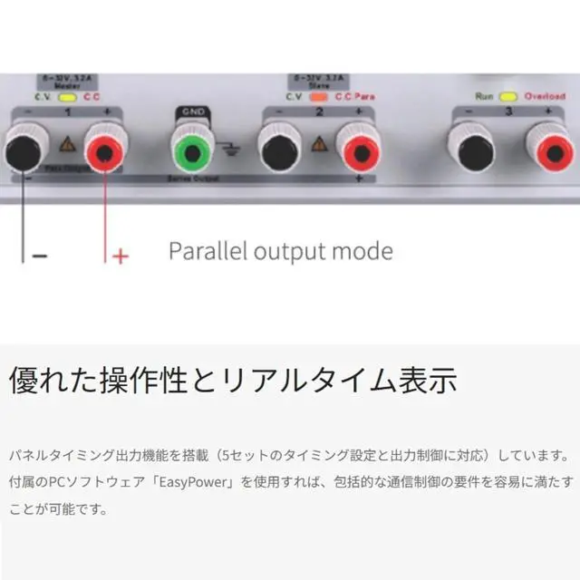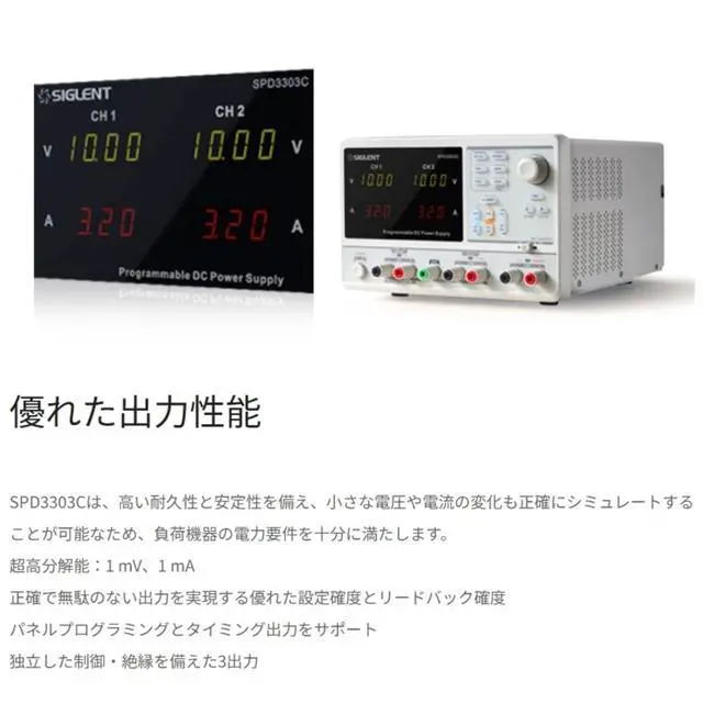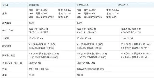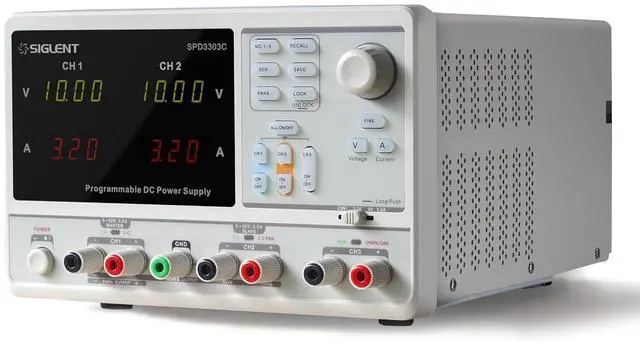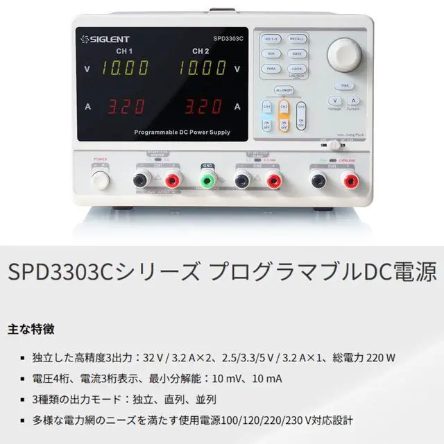 Triple output 220 watts 0-32V / 0-3.2A x 2. 2.2, 3.3, 5V / 3.2A Four displays. Voltage and current readout for Ch1 & Ch2 Output modes: series, independent, parallel Usb interface. Easy power software included