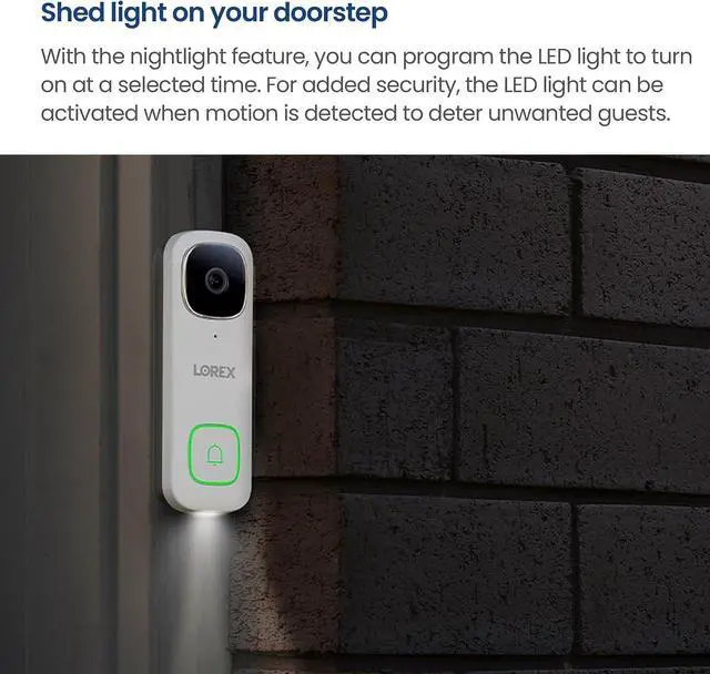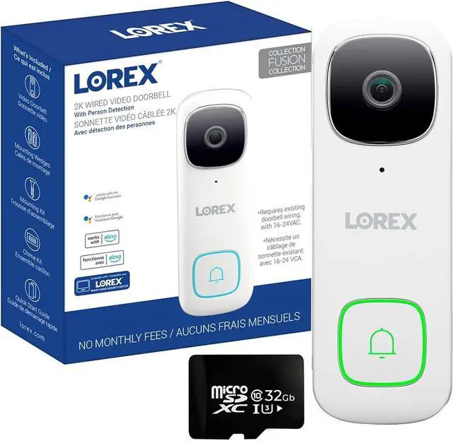 The video showcases the product in use.The video guides you through product setup.The video compares multiple products.The video shows the product being unpacked. Merchant video Speak With Ease No Monthly Fees Lorex Classic App Smart Home Compatibility Answer your doorbell with Hey Google Ring and Start Recording Lorex 2K Wi-Fi Video Doorbell 32GB