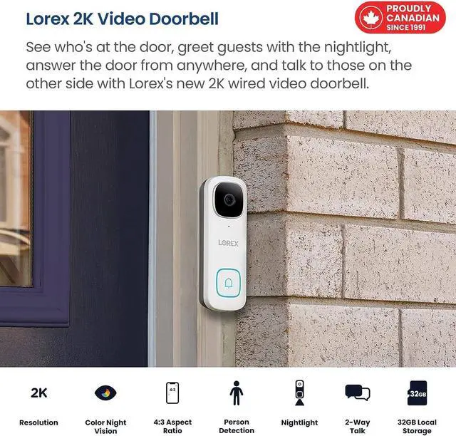 Lorex 2K Wired Wi-Fi Video Doorbell | 32GB Local Storage, No Monthly Fees | Person Detection | Colour Night Vision | -20°C to 50°C Operating Range | 2-Way Talk | IP65 Weatherproof | Proudly Canadian