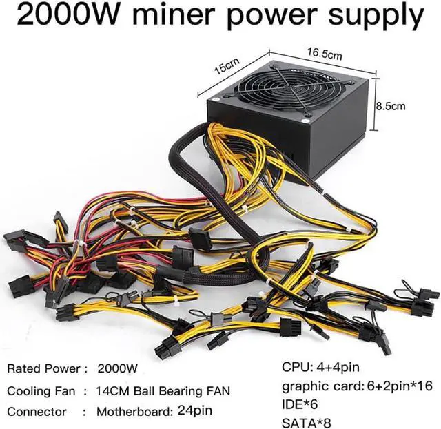 2000W Mining Power Supply for 8 GPU, 2000W PSU Modular Power Supply for 8 GPUs ETH Rig Ethereum Miner,100V-270V PSU with Adapter Cable, Updated 2022, Black