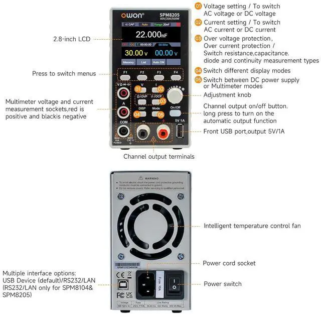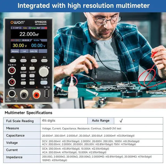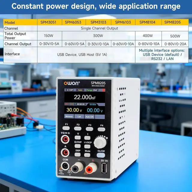 Versatile 2-in-1 Design: Our combination of DC power supply and multimeter provides multiple functions in one device and delivers excellent value for money, less footprint, high performance and improved working efficiency. OWON SPM8205 with an output power of 500W and an output range of 80V/20A, the laboratory power supply also features a USB charging port that supports SCPI. You can charge your mobile phone or other devices.