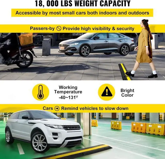 This cable ramp is designed to control traffic speed and provide enough room for road cables while not causing damage to cars or roads. It adopts high-quality rubber construction, PVC cover for long-term service, 22046 lbs/ 10000 kg load capacity, and is secure on use at night.