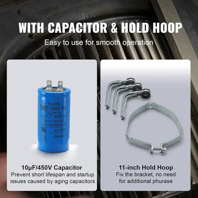 Convenient Accessories Included: The motor comes with convenient accessories, including the CBB60 10F/450V capacitor. This capacitor helps prevent issues such as a shortened lifespan, overheating, and motor startup failure caused by an old capacitor. Additionally, an 11-inch hold hoop is provided as an installation bracket, reducing the need for additional mounting hardware purchases.