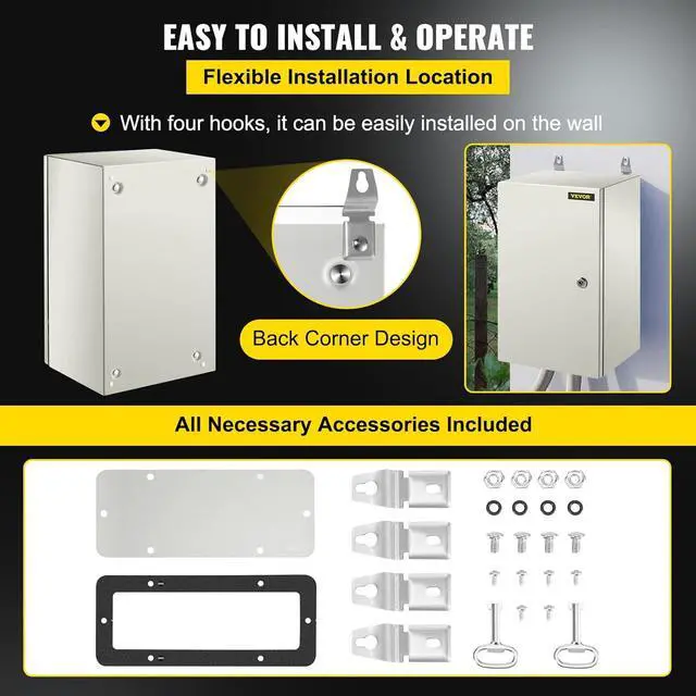 CONVENIENT INSTALLATION- The metal enclosure box is equipped with a removable galvanized mounting backplate to facilitate installing the electrical components. Complete accessories and four wall mounting holes in the back make it easy to fix the wall's electrical box.