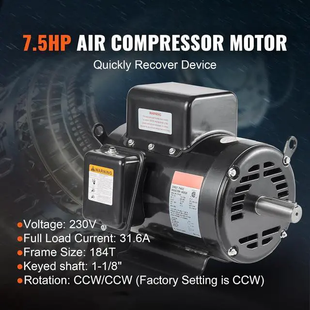 High Performance: 7.5HP, 3450 RPM, Single Phase, Full Load Amps: 31.6Amp, 230V 60Hz, SF: 1.0.