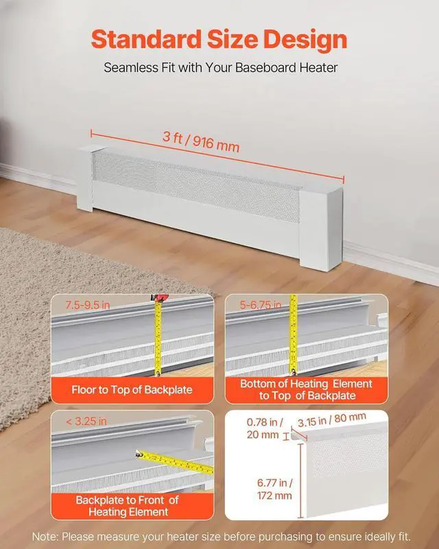 Standard Size: This 3 ft / 914.4 mm baseboard heater cover fits heaters with floor to top of backplate: 7.5-9.5 inch, bottom of element to top of backplate: 5-6.75 inch, and a back panel-to-element front distance of less than 3.25 inches