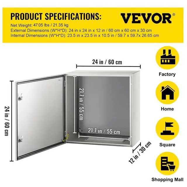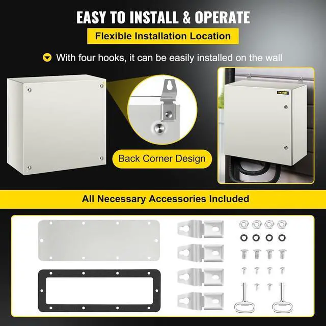 • IP66 Waterproof Grade: The metal electrical enclosure box complies with NEMA 4X & IP66, which has excellent water resistance, and dust resistance. The sealing strip has excellent sealing performance. Direct us as the first option when unfulfilling your demands. VEVOR will resolve any feedback.