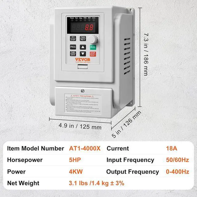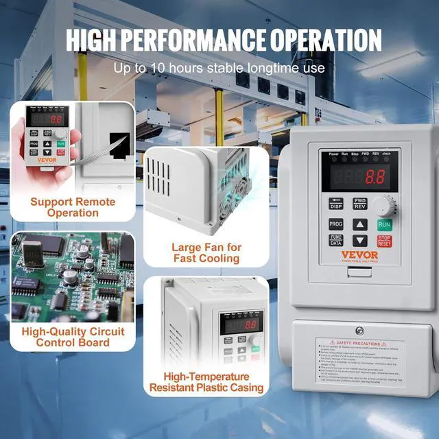 VEVOR 4KW18A5HP VFD provides precise motor speed control via accurate frequency and amplitude of motor drive current. With easy wiring, a user-friendly panel, and a soft start/stop, it simplifies operations, enhances energy efficiency, and minimizes machinery faults.