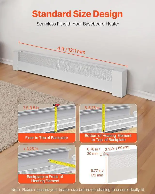 Standard Size: This 4 ft / 1211 mm baseboard heater cover fits heaters with floor to top of backplate: 7.5-9.5 inch, bottom of element to top of backplate: 5-6.75 inch, and a back panel-to-element front distance of less than 3.25 inches