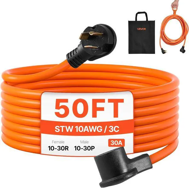 30A Pure Copper Cable: This 10AWG heavy-duty extension cord, with a length of 50 ft / 15.2 m, is rated for 125V/250V and 30A current, featuring a 3-prong NEMA 10-30P to NEMA 10-30R plug
