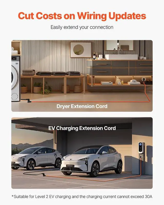 EV Charger Extension Cord: This dryer cord can serve as an extension for your EV charger, suitable for Level 2 EV charging, such as for Tesla Model 3, Model S, Model X, and Model Y (it is recommended to adjust the charging current to 30A or below)