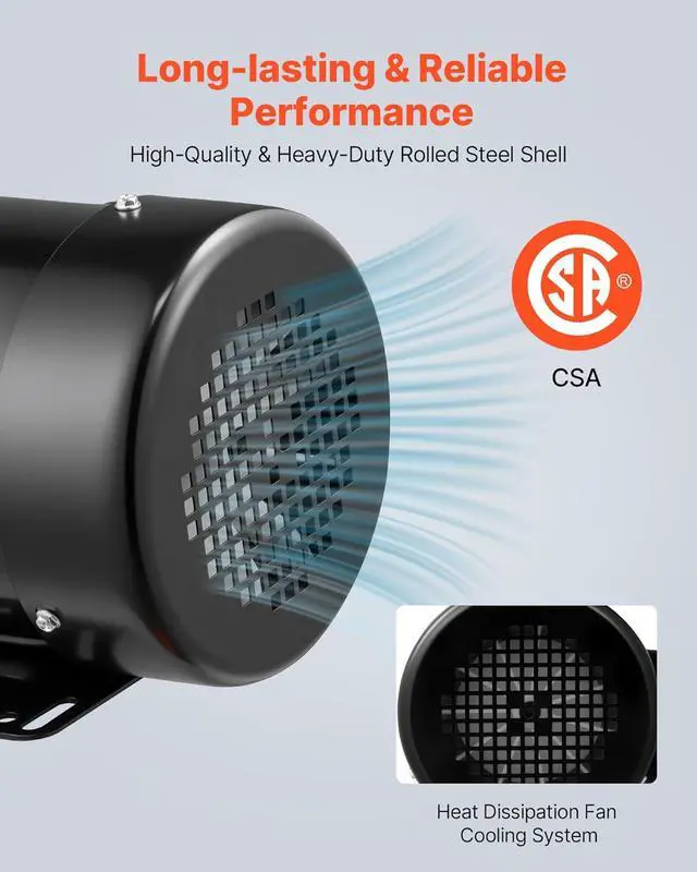Secure & Reliable: This air compressor motor is CSA-certified and features a rolled steel housing for dependable strength. Its improved cooling system helps reduce overheating, while a manual reset overload protector supports stable, long-term performance