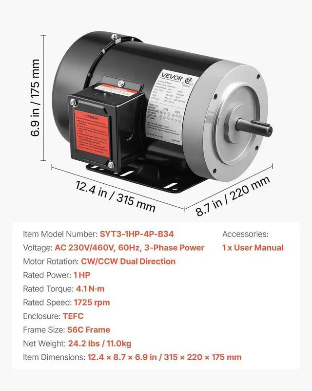 High Performance: 1HP high-performance motor featuring 4.1 N.m rated torque. Designed for AC 230V/460V 60Hz, three-phase power. The air compressor electric motor operates at 1725 RPM for fast, reliable speed