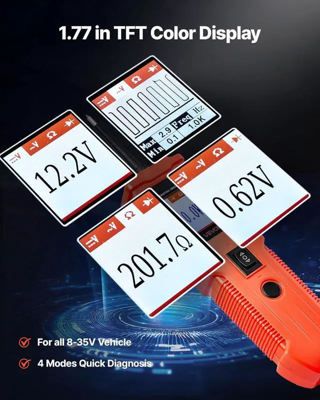 Four Modes & 1.77 in TFT Screen: The power circuit probe tester features mode buttons for 4 diagnostic modes: DC voltage, AC voltage, resistance, and diode. The 1.77-inch TFT color screen displays values and waveform changes for real-time analysis