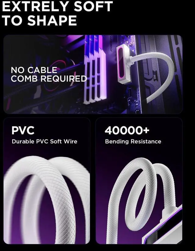 Experience the ultimate in cable management and PC aesthetics with our 90° right-angle power extension cable. Designed for effortless installation and superior durability, this cable ensures compatibility with all cable terminals without the need for bending. Its PVC construction withstands over 40,000 bends, promoting a clean and organized desktop environment. With 7 dynamic RGB lighting effects, it adds a vibrant visual touch to your system, though it's not compatible with custom Aura Sync adjustments. Crafted with 18AWG wire and brass plating, it supports up to 650W, minimizing electrical resistance and power loss. At 30cm in length, it's perfect for extending your power reach, while its diamond-patterned design adds depth and texture under any light. Ideal for most 24pin motherboards and power supplies, it's the perfect accessory for a sleek and streamlined computer space.