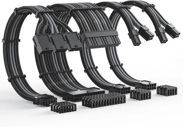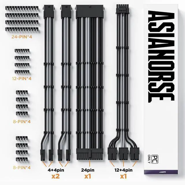 AsiaHorse 12VHPWR Cable Extension Kit, 16AWG 16Pin PSU Cable Extension Kit Soft Braided Sleeved Cables for 24pin ATX /4+4pin EPS /12+4pin, 30CM Length with Cable Combs (Black Gray, 4Kit)