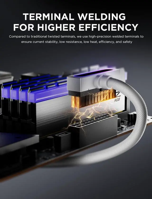 **Efficient Power Delivery**: 24pin, 18AWG cable with copper wire core and Brass Tin Plated Terminal (Resistant to high voltage and high temperature), offering lower electrical resistance. Supports up to 900W power input(single wire) and 2500W Power supply (whole set) , reducing current loss and preventing blue screens.