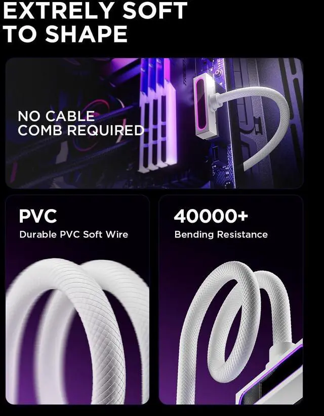 **Installation & Durability**: Flexible installation with easy bending. Long-lasting PVC soft line material. Over 40,000 bends endurance without cable combs for streamlined cable management.