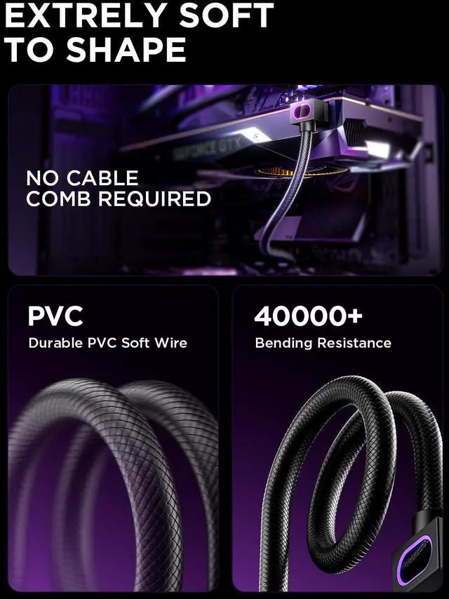 **Installation & Durability**: Flexible installation with easy bending. Long-lasting PVC soft line material. Over 40,000 bends endurance without cable combs for streamlined cable management.