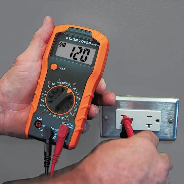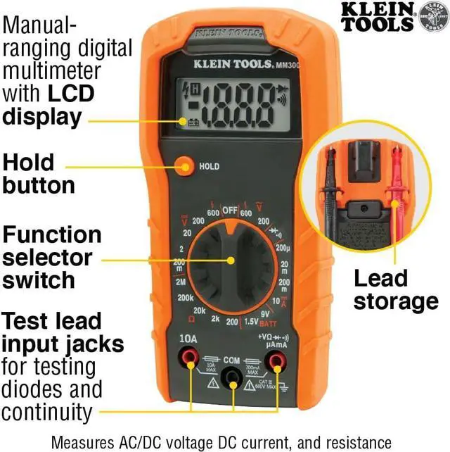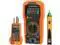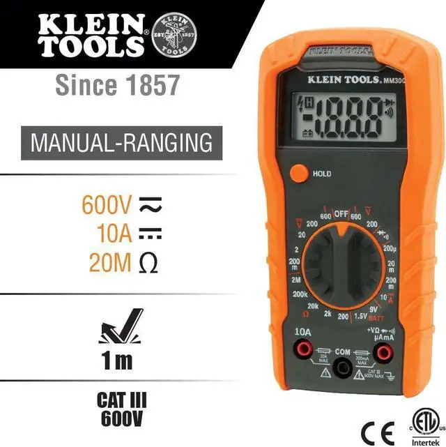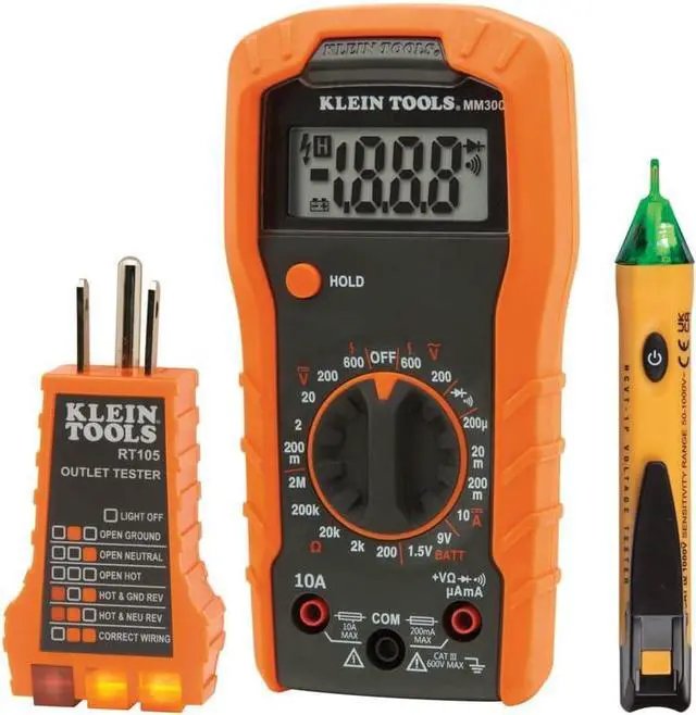 Klein Tools Multimeter Test Kit contains Cat. No. MM300 (Manual-Ranging Digital Multimeter), Cat. No. NCVT1P (Non-Contact Voltage Tester) and Cat. No. RT105 (Receptacle Tester). The MM300 measures DC current, AC/DC voltage and resistance. The NCVT1P autom