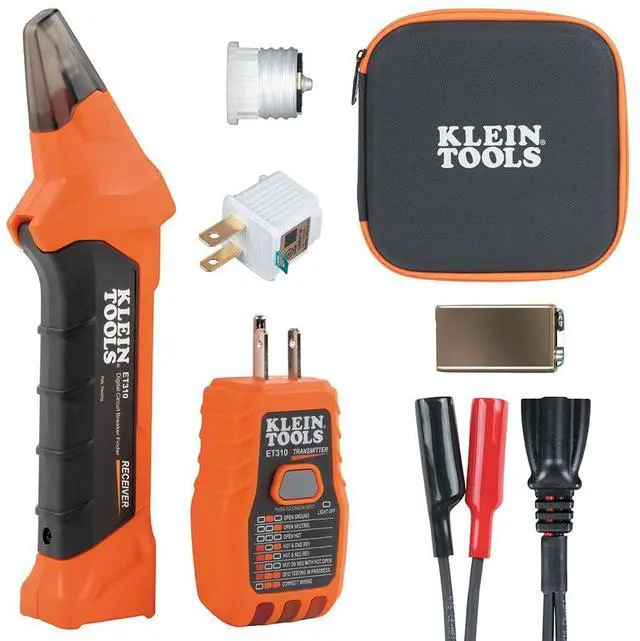 The Circuit Breaker Finder Kit includes components for various 90-120V AC circuit diagnostics. The receiver locates the correct breaker for outlets or fixtures, and the transmitter can connect to other fixtures using the included accessories. Use the transmitter with the alligator clip adapter for bare wires and the light socket adapter to locate the correct circuits. The transmitter also tests GFCI outlets. Components are stored in a premium carrying case with a foam insert for organization.