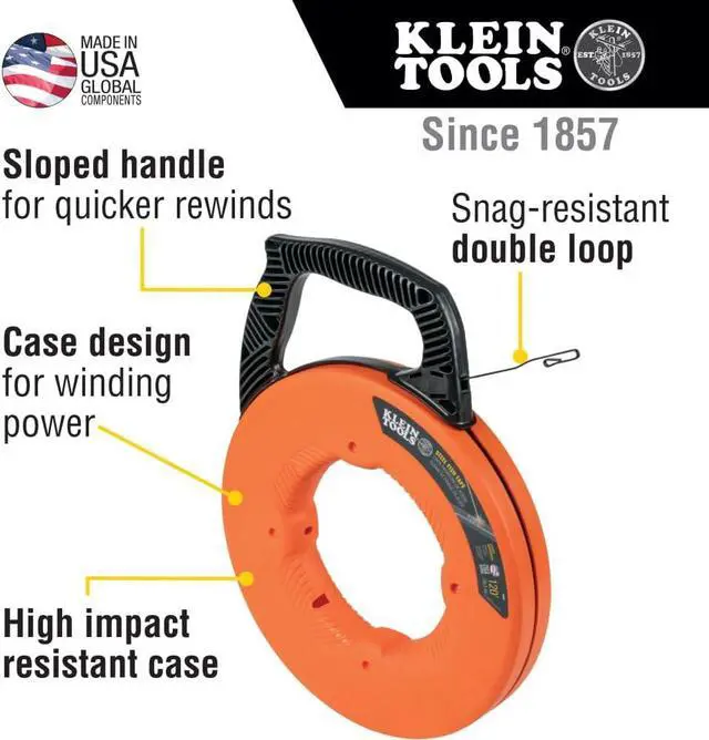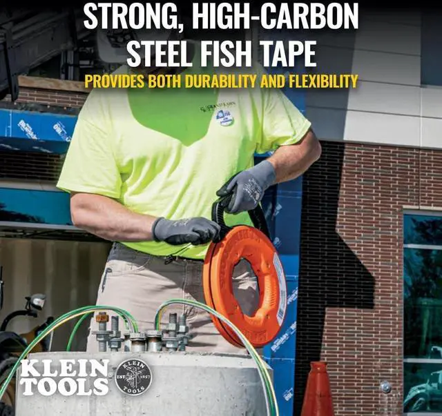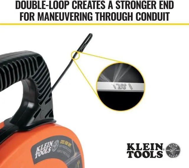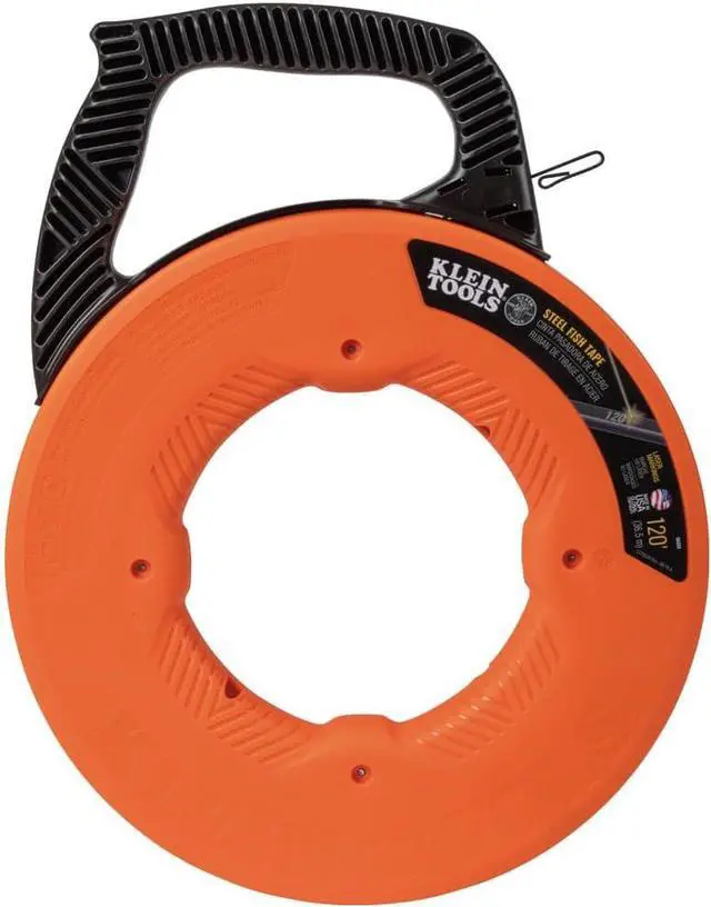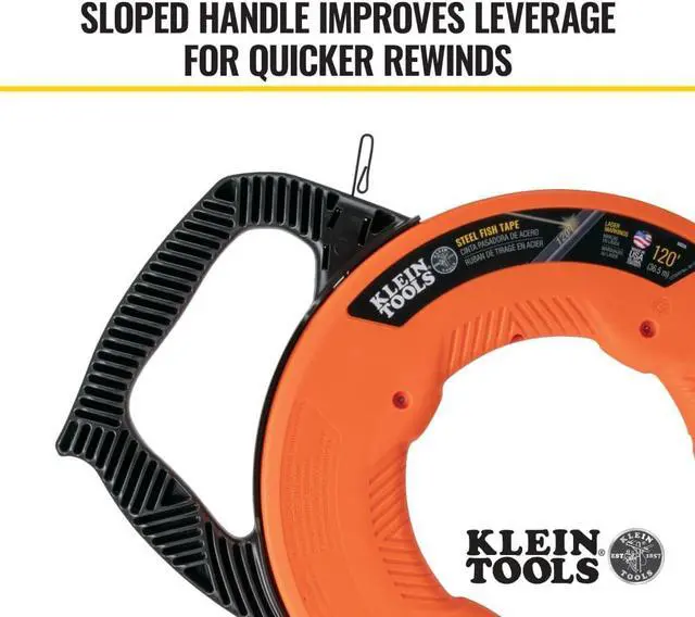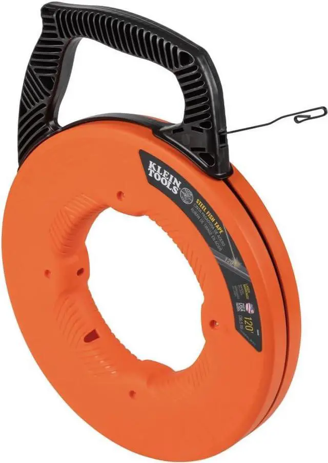 The Klein Tools' 120-Foot, High-Carbon Steel Fish Tape is perfect for wire runs associated with commercial, residential and voice-data-video installations. The optimized housing and handle design decreases payout effort and reduces binding. A multiple-position handle allows for a firm, steady grip as you pull or rewind the tape. The unique interior case shape combines the leverage of square cases and the comfort of round cases, which makes rewinding tape after a long run easier. The tape features laser-etched descending markings placed at every foot. These markings allow you to accurately measure the depth of conduit runs and determine the amount of tape left to pay out.