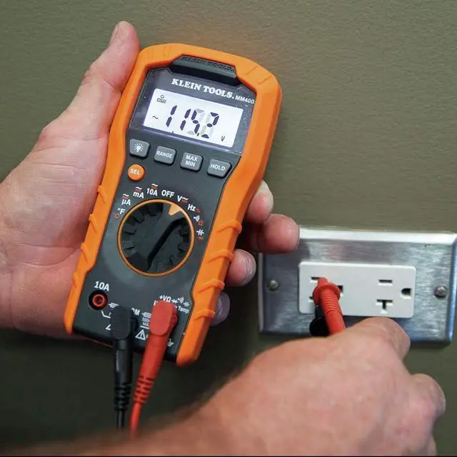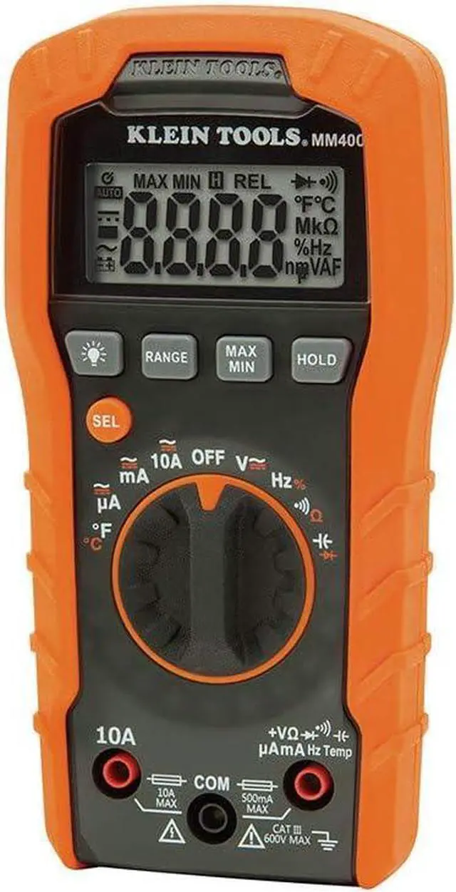 Klein Tools MM400 is an auto-ranging multimeter that measures AC/DC voltage, AC/DC current, and resistance. It can also measure temperature, capacitance, frequency, duty-cycle, and test diodes and continuity. Klein Tools' Test and Measurement product line was exclusively designed from the ground up by electricians for electricians. Years of field research, combined with extensive input from electricians across America, inspired the development of meters and electrical testers loaded with innovative, time-saving features.